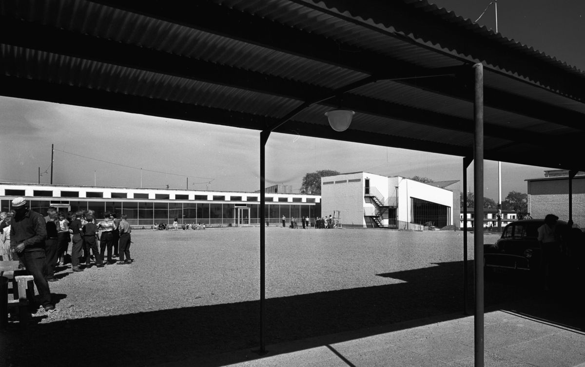 Exteriör, centralkapprum och aula sedda från loggian utmed specialrumsbyggnaden
