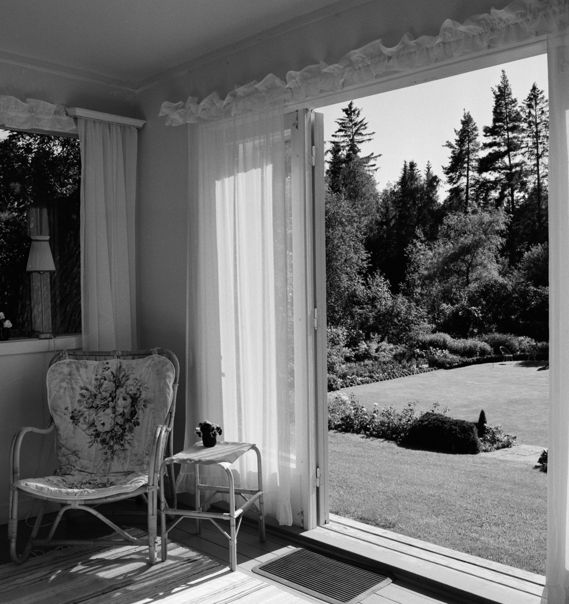 Interiör, rum med öppen vägg ut mot grönskande trädgård