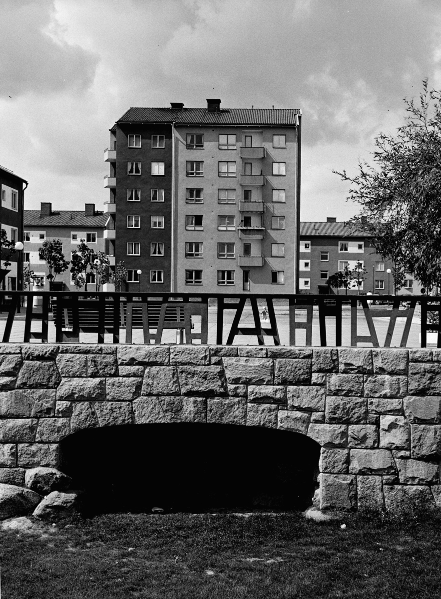 Valvbro i sten över å, flerbostadshus i fonden