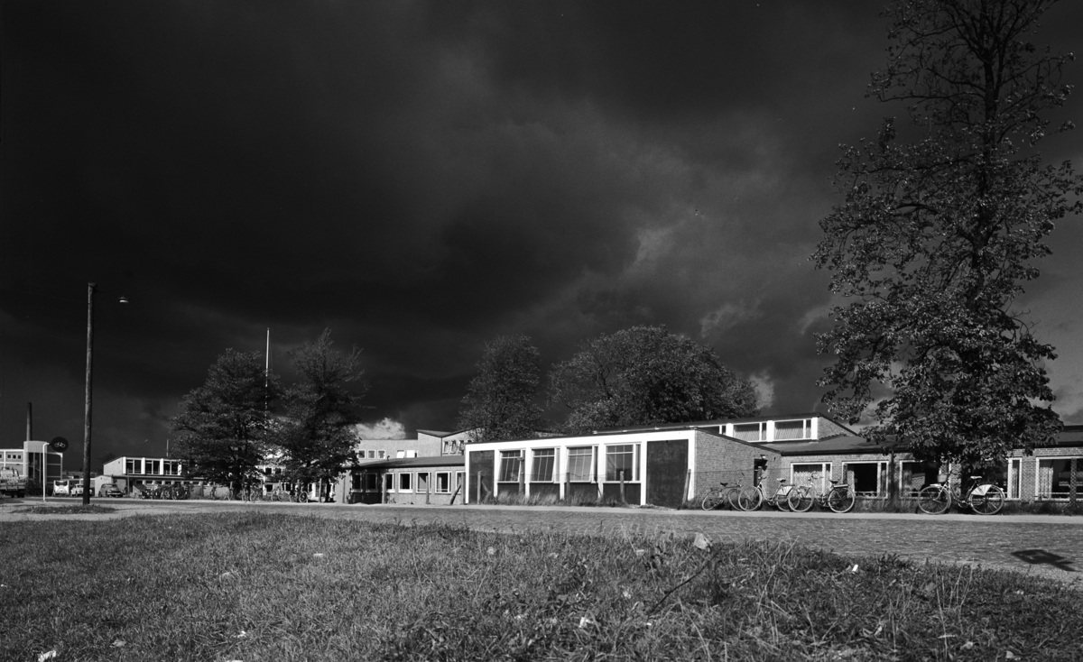 Exteriör, fasad mot öppen plan. Ovädersmoln på himlen