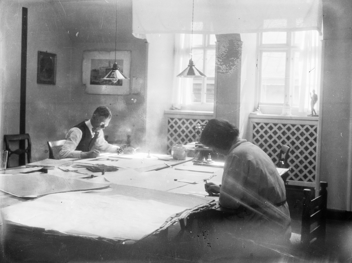 Titel: Arkitektkontor Ritbord med en man och en kvinna i arbete Interiör