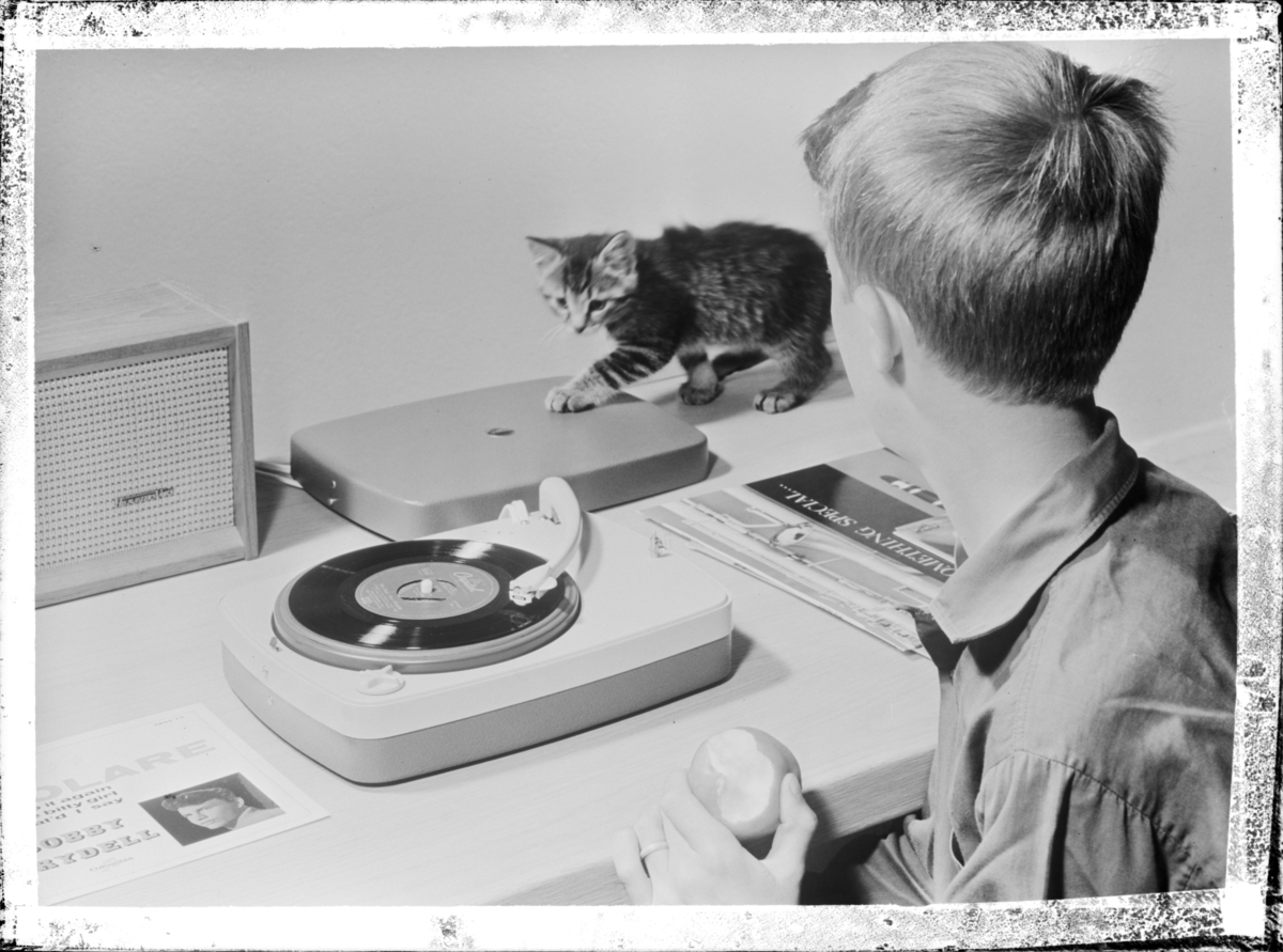 REP. FÄRGDIA. HMV SPELARE MED POJKE OCH KATT