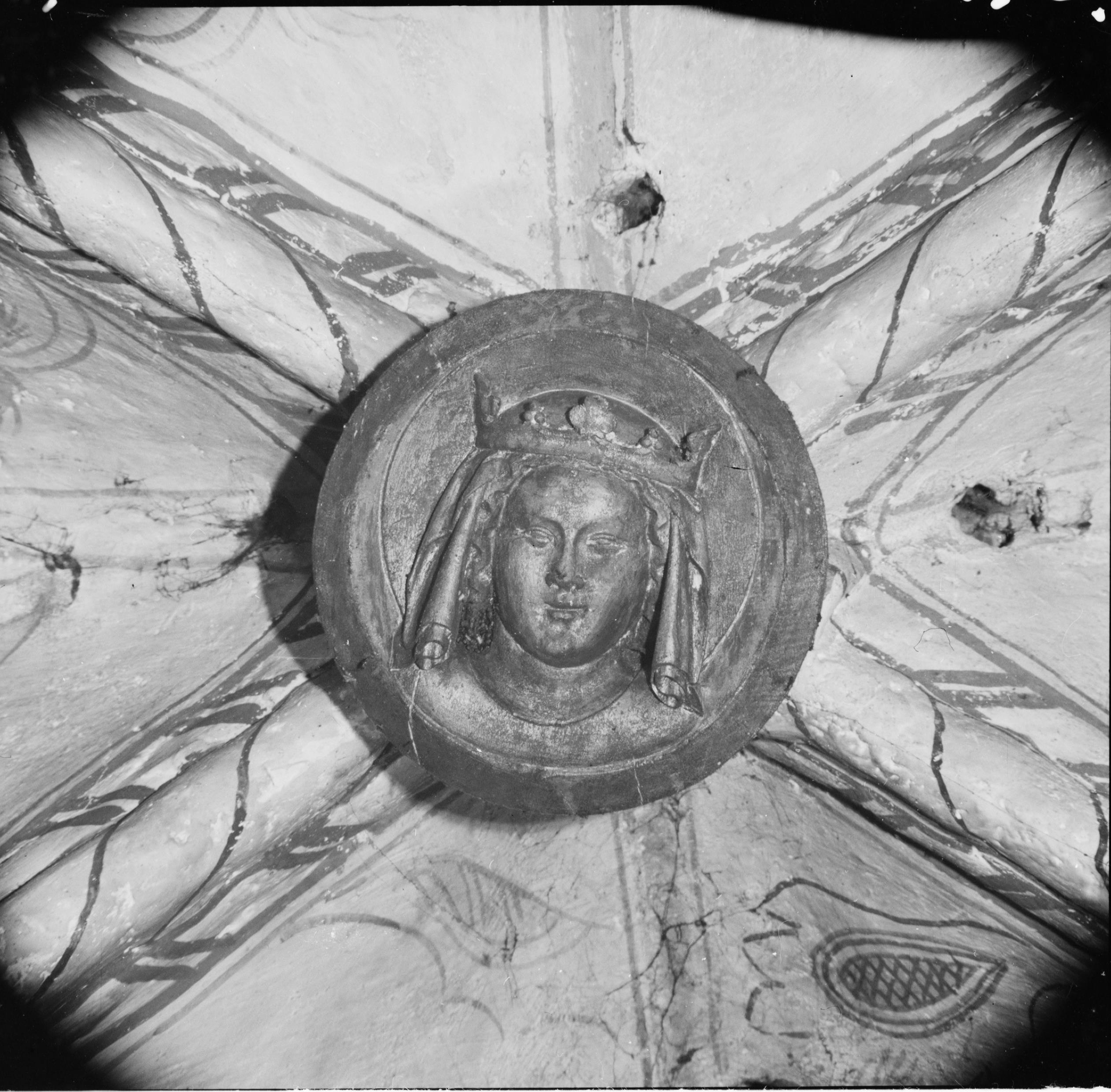 Slutstensplatta av skulpterad ek föreställande kvinnligt helgon.