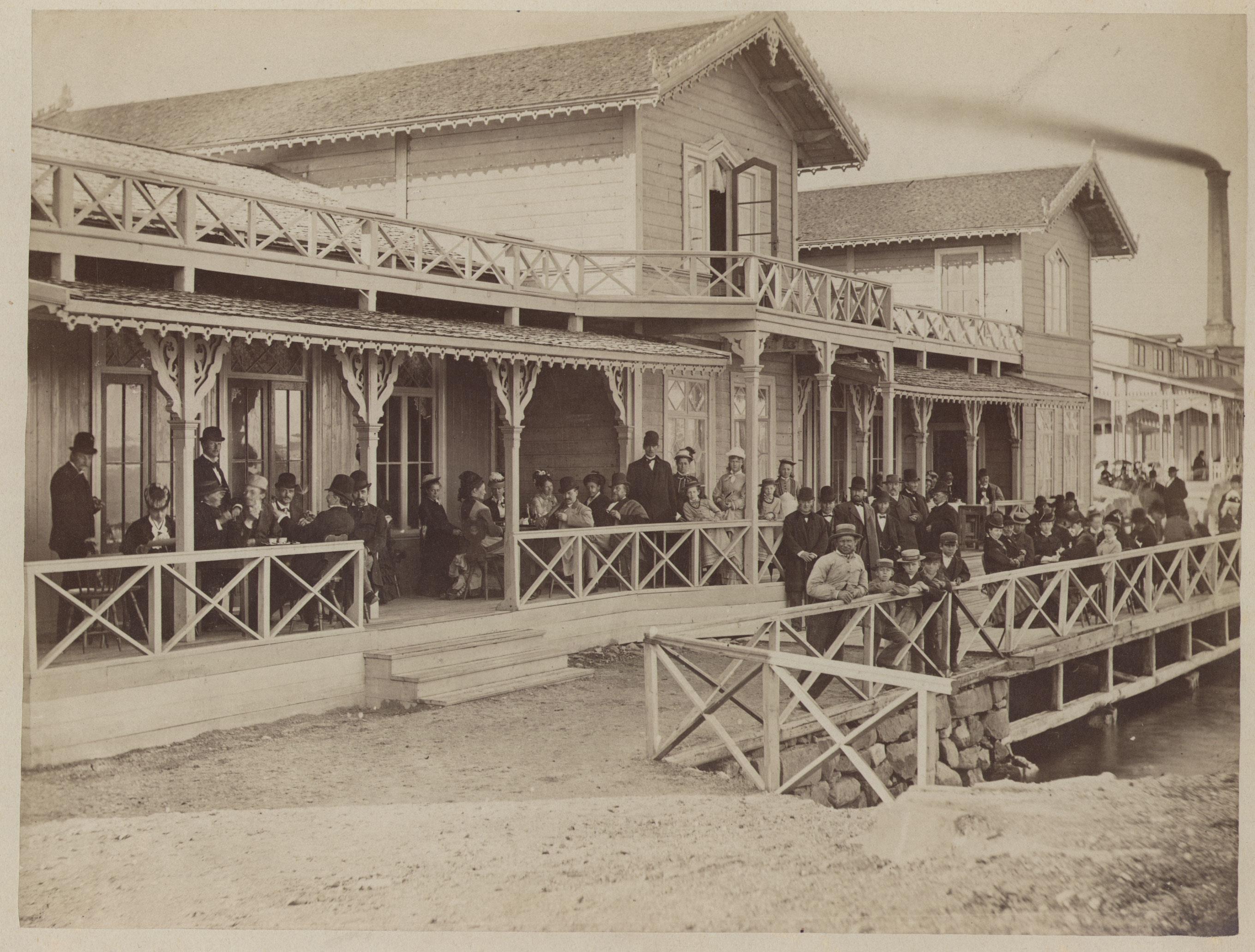 Människor vid havsbadsrestaurangen, byggd 1869. Bilden är tagen på 1870-talet.