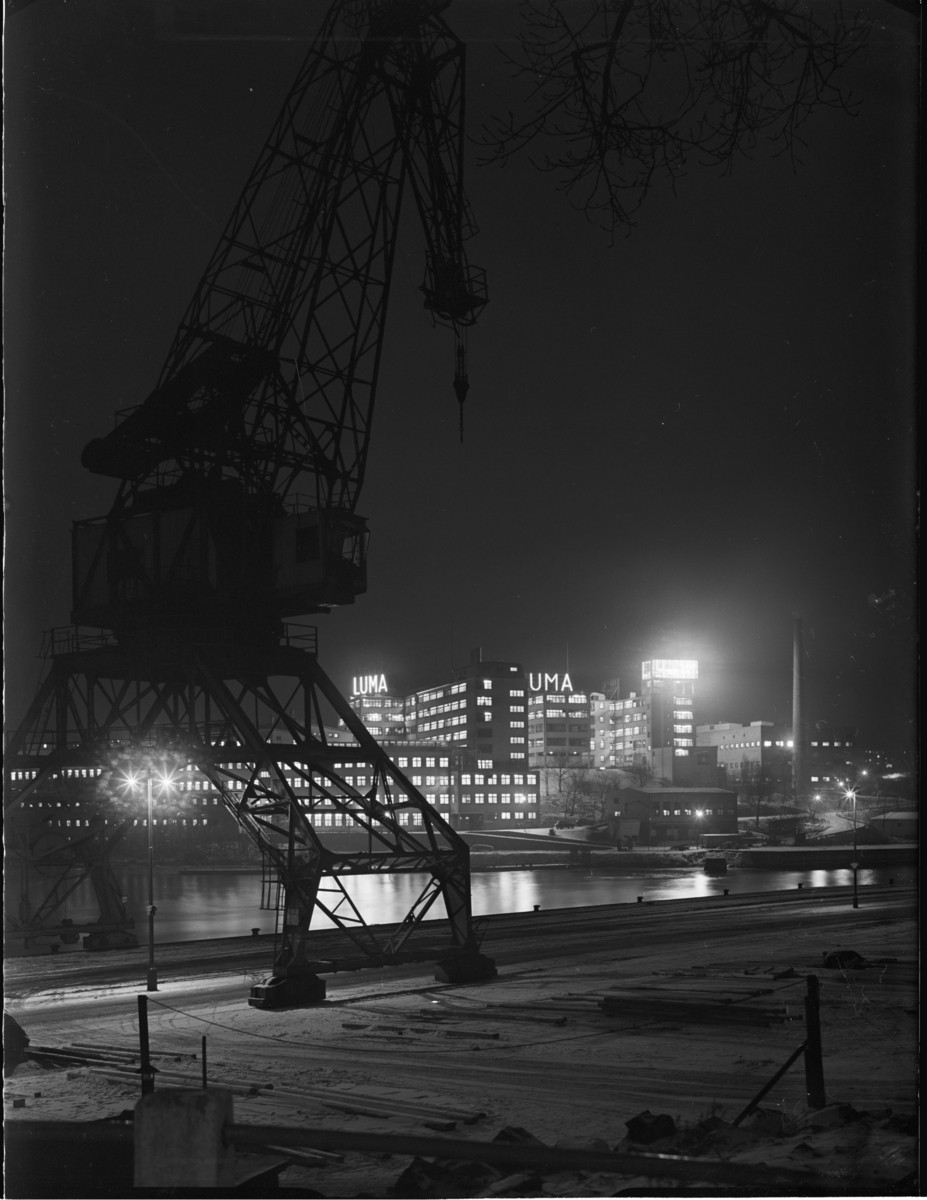 FABRIKEN I KVÄLLSLJUS MED LYFTKRAN