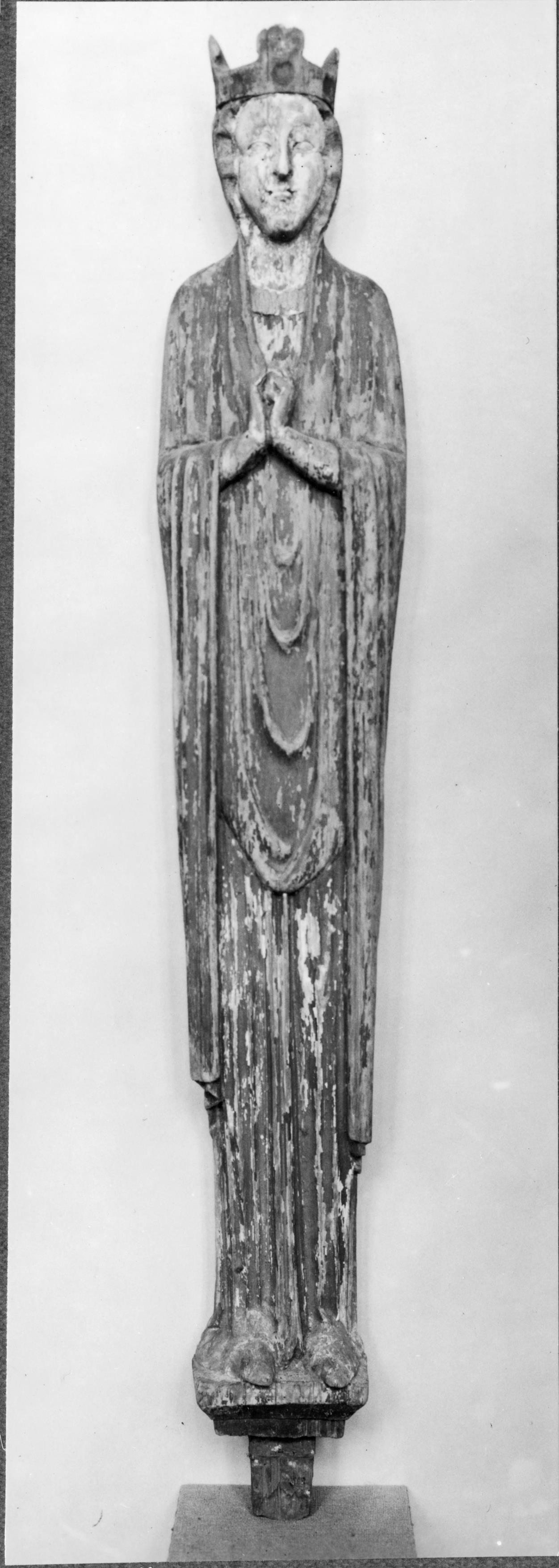 Skulptur, Maria ur en kalvaliegrupp, från 1200-talets mitt av snidad och målad ek. Klädd i grön tunica och röd mantel.
