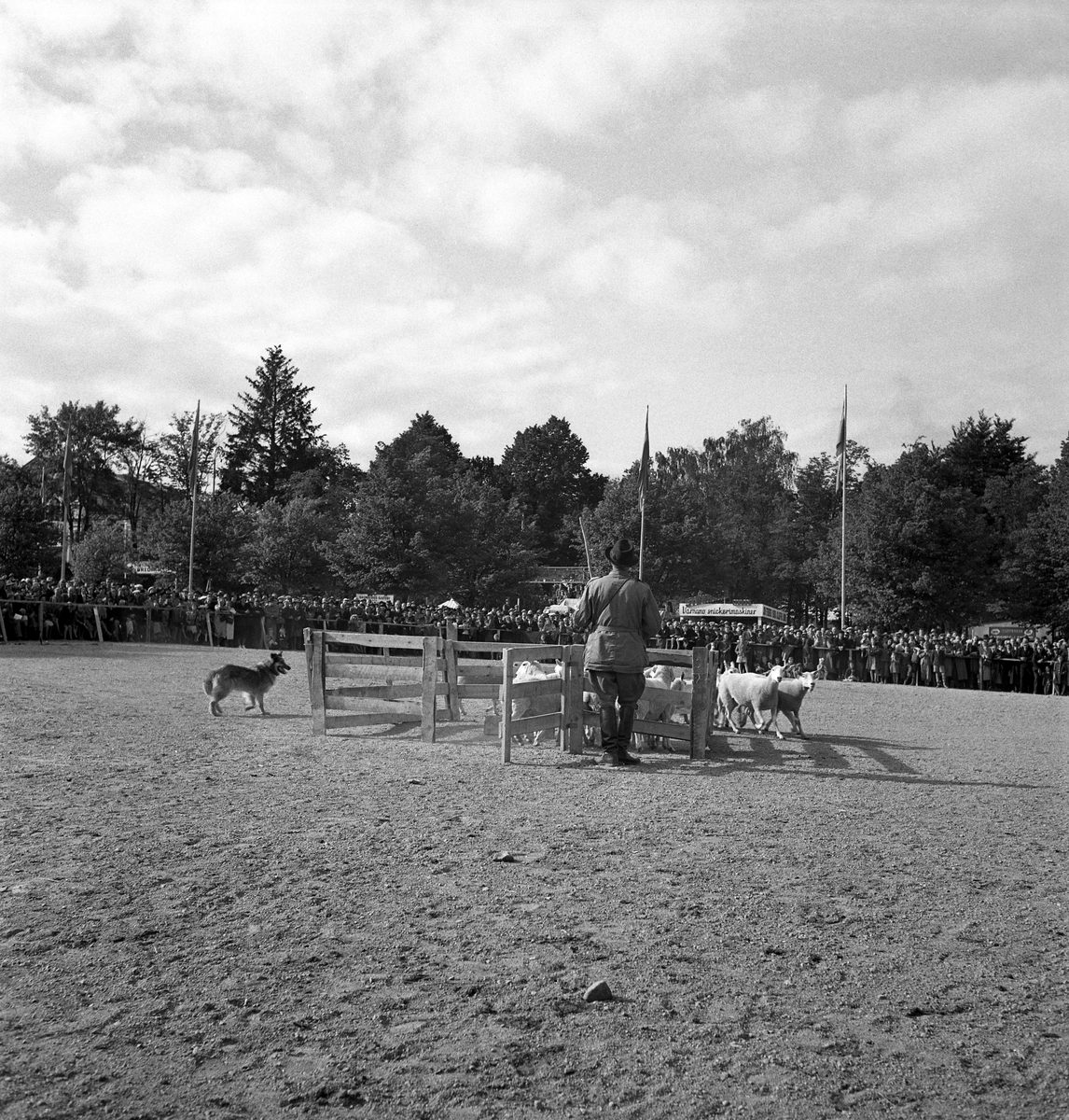 Uppvisning av en fårskock med vallhund på skolgården till Växjö Högre Allmänna Läroverk.