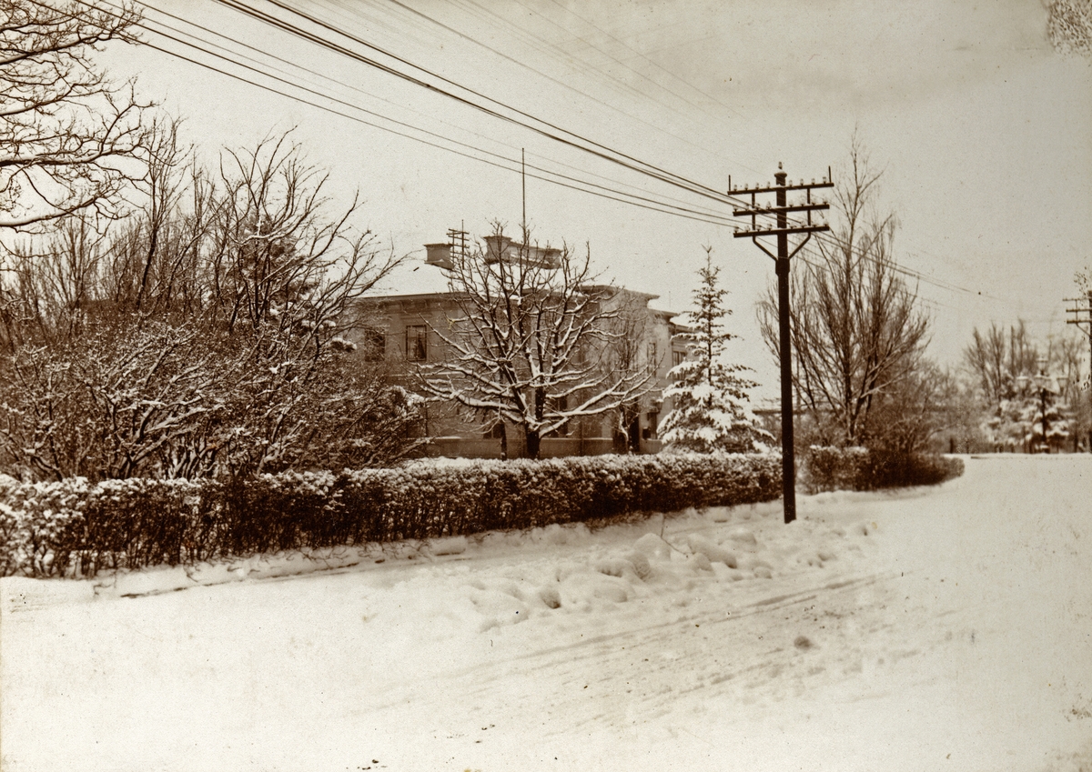 Den lilla järnvägsparken vid Norra Järnvägsgatan, med Växjö järnvägsstation i bakgrunden. Ca. 1910-tal.