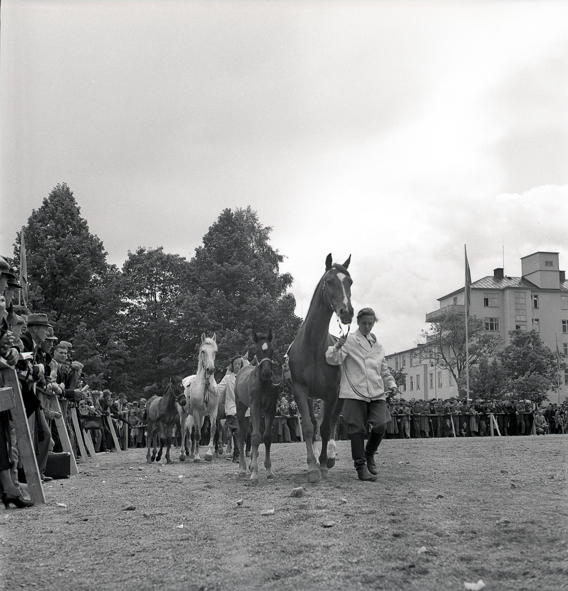 Hästpremiering. Några personer leder runt några hästar på skolgården