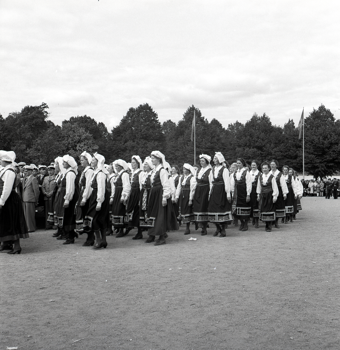 Ett antal kvinnor i Värendsdräkt tågar in på planen framför