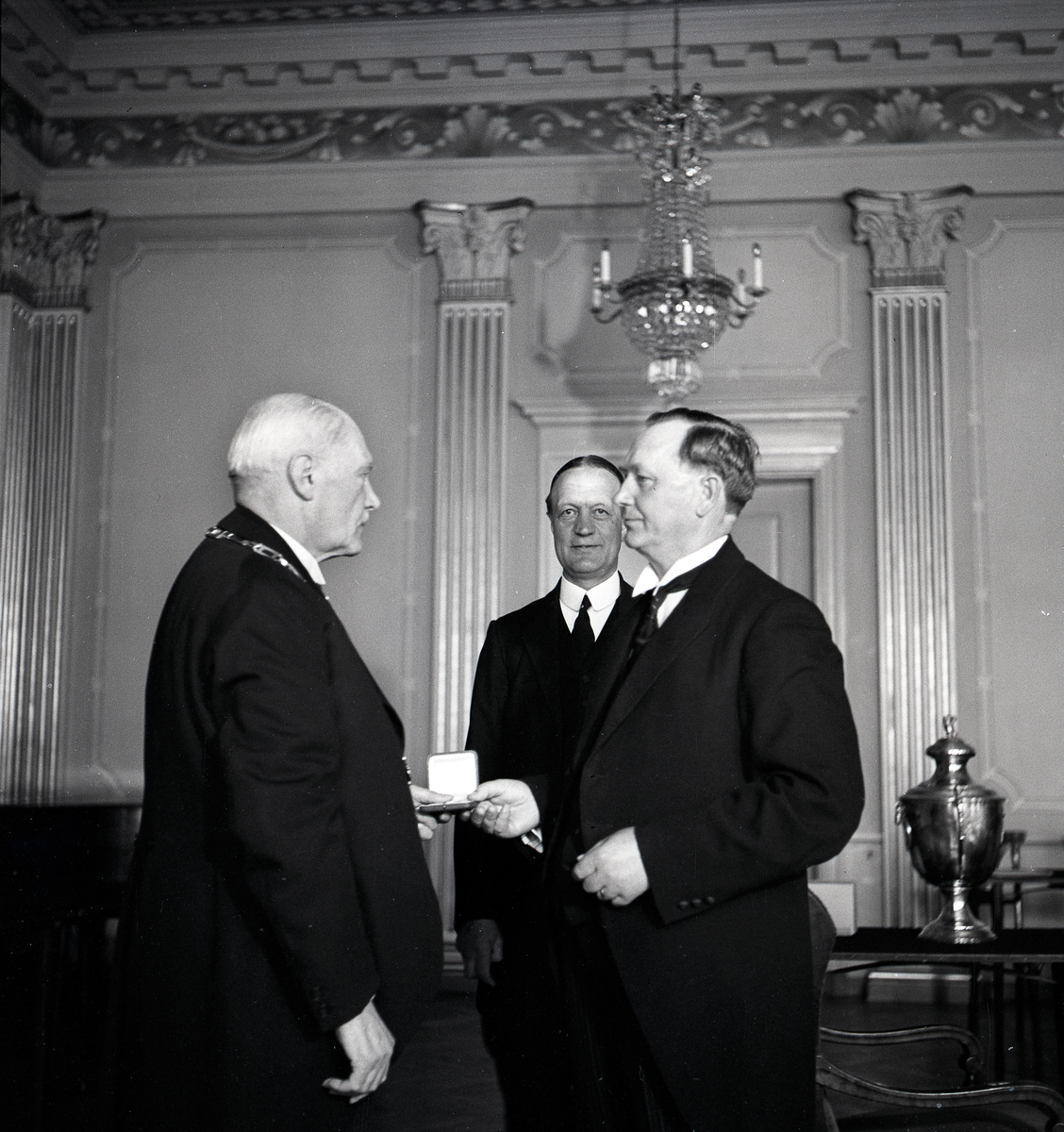 En äldre man (borgmästare Theodor Sundberg (1875-1948) ?) får en förtjänstmedalj av några andra herrar.