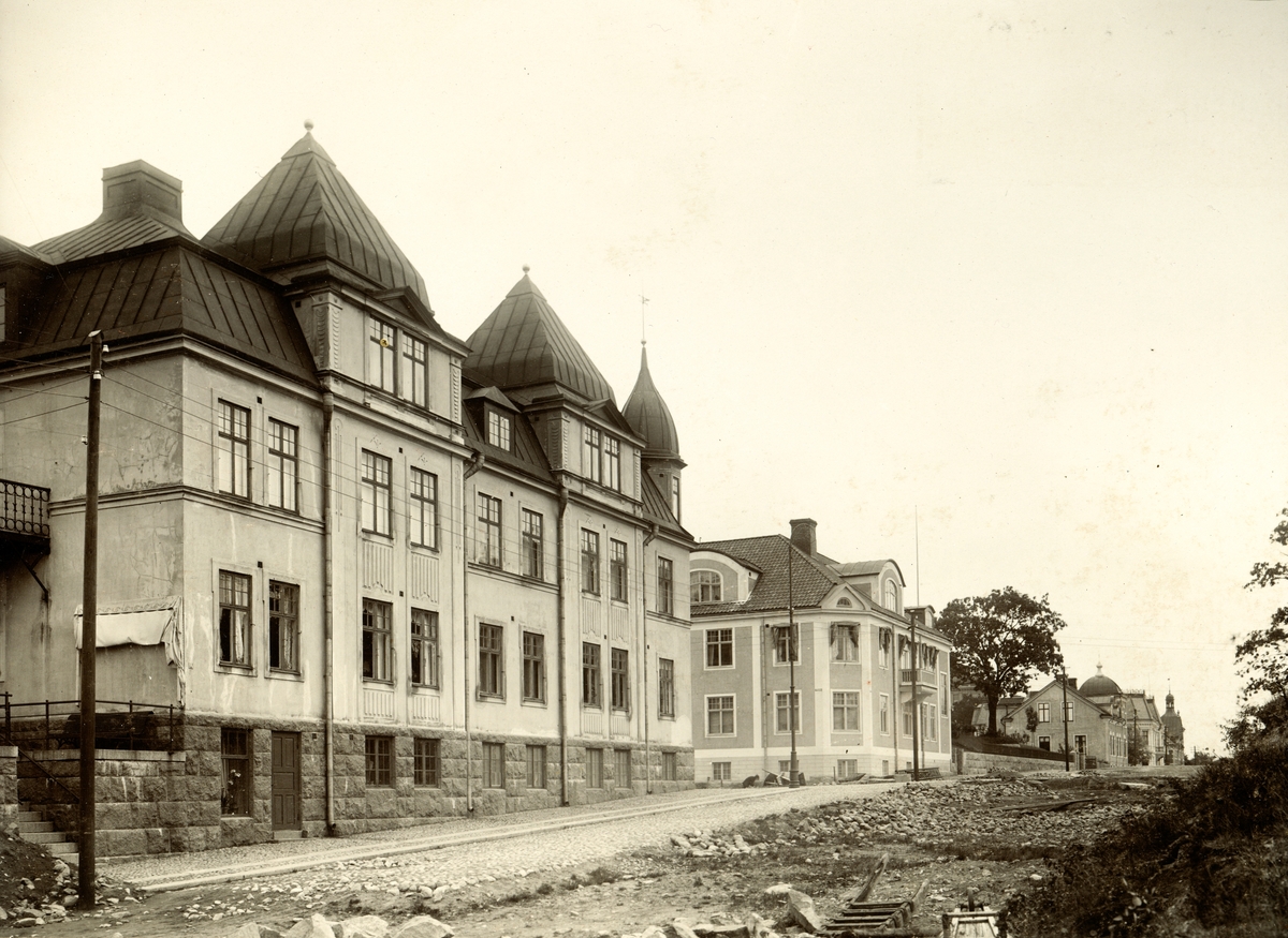 Stenläggning av Trädgårdsgatan, vid korsningen med Vallgatan. Söder i Växjö, ca. 1913.
