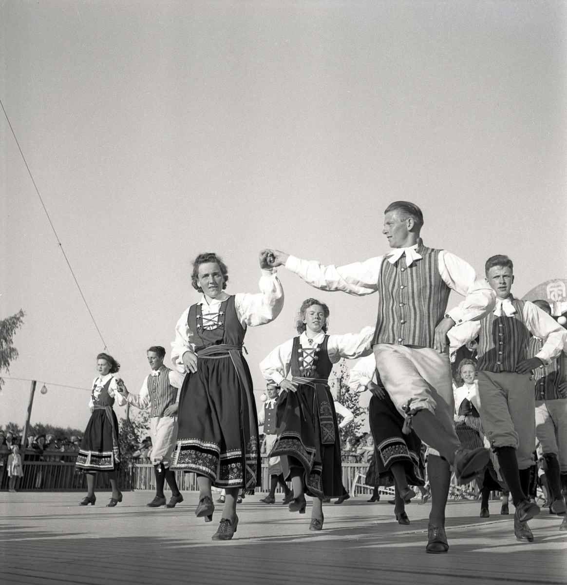 Några personer i Värendsdräkt m.m. har uppvisning i folkdans