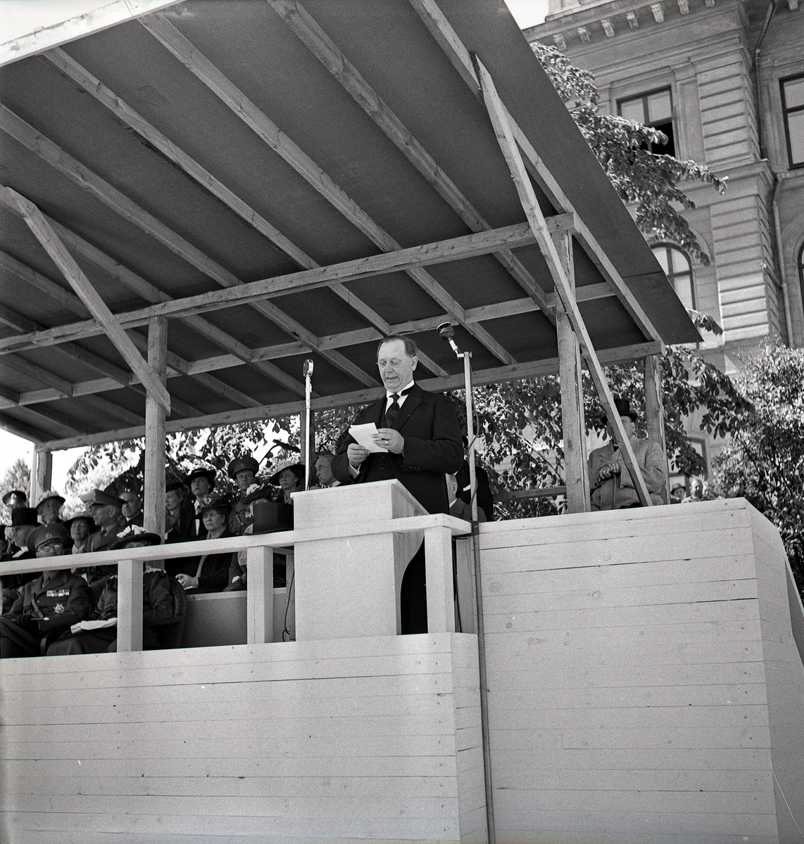 Jubileumsutställningen. En av invigningstalarna. Bakom räcket till höger skymtar kronprins Gustaf Adolf, biskop Brilioth och andra hedersgäster.