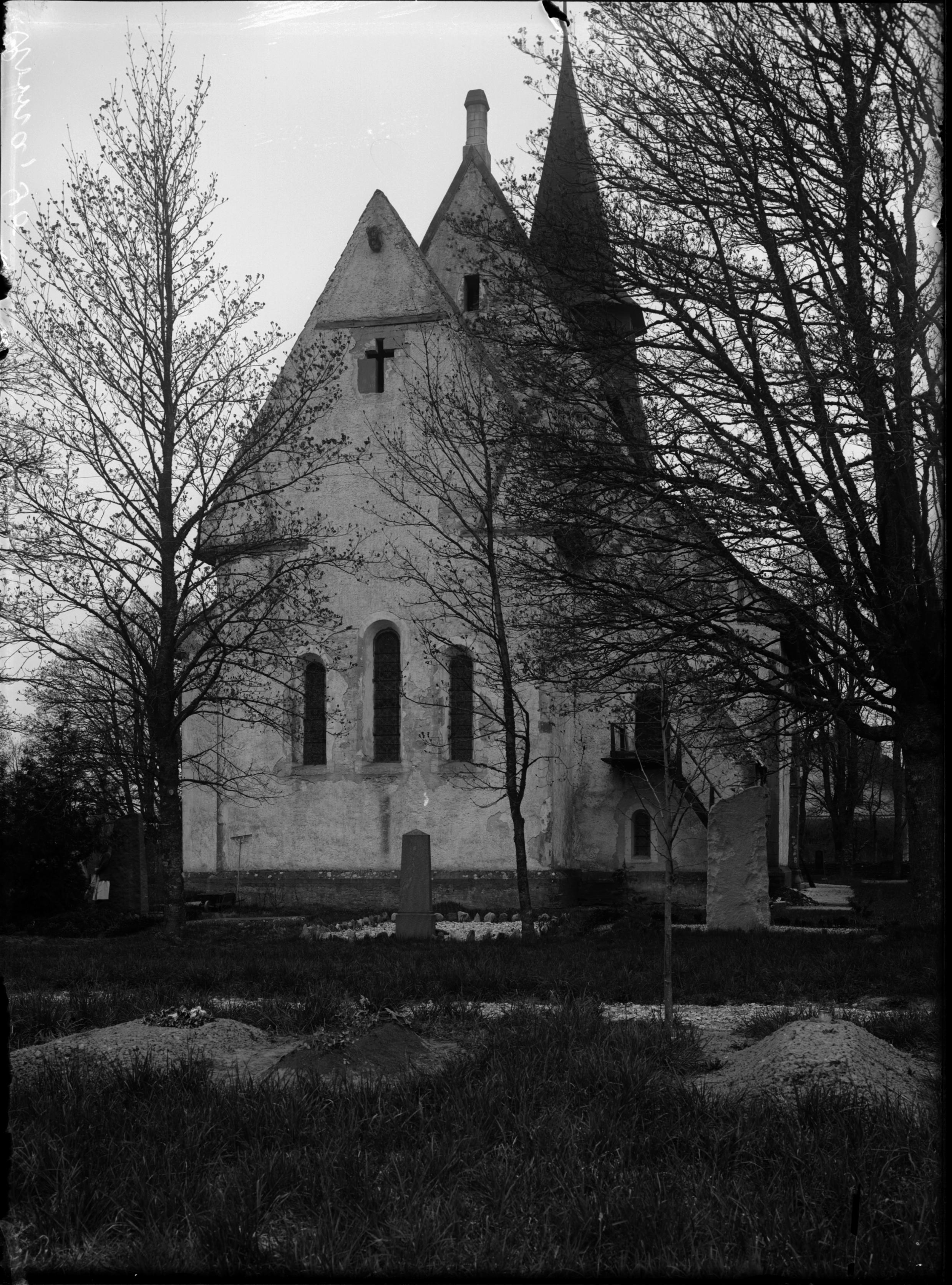 Kyrkan från öster. Den uttagna runstenens plats vid korsgluggen på korgaveln .