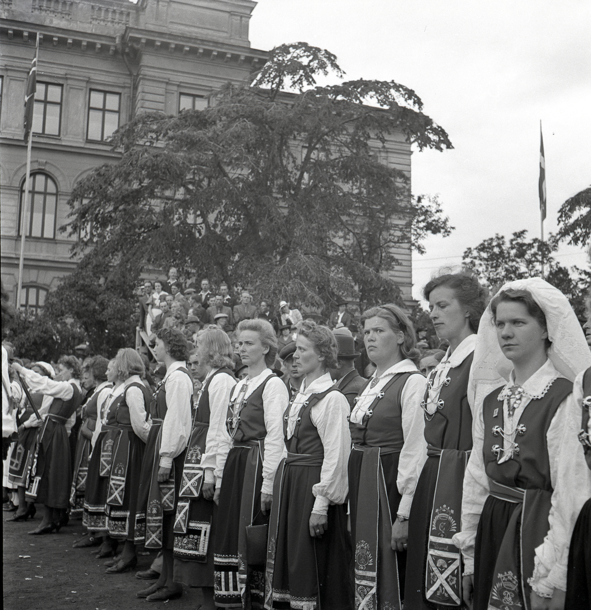 Kvinnor i Värendsdräkt. I bakgrunden syns en del av Växjö