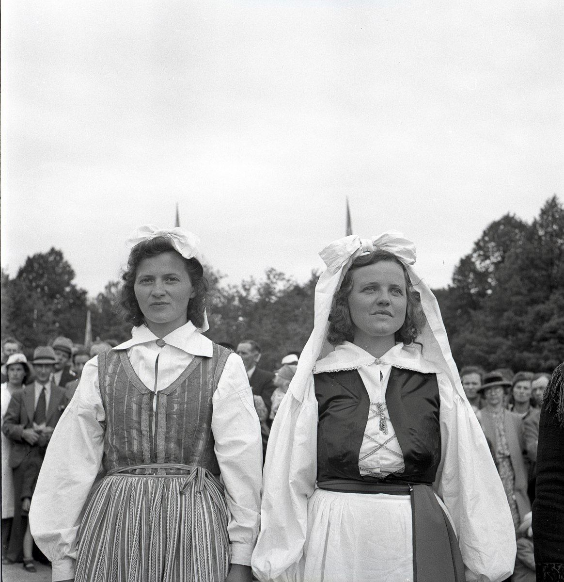 Kvinnor i olika folkdräkter. I bakgrunden skymtar en del av