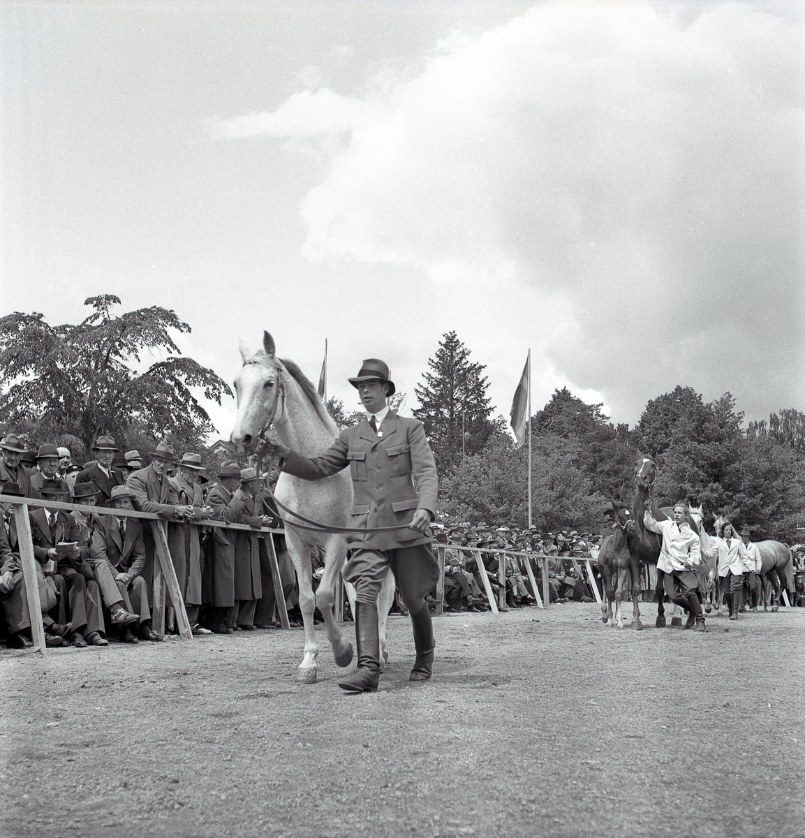 Hästpremiering. Några karlar leder runt några hästar på skolgården