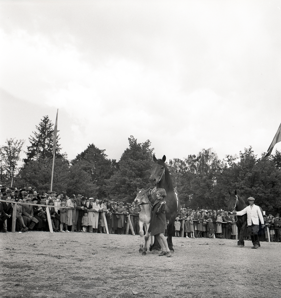 Hästpremiering. En liten flicka med häst och föl på skolgården
