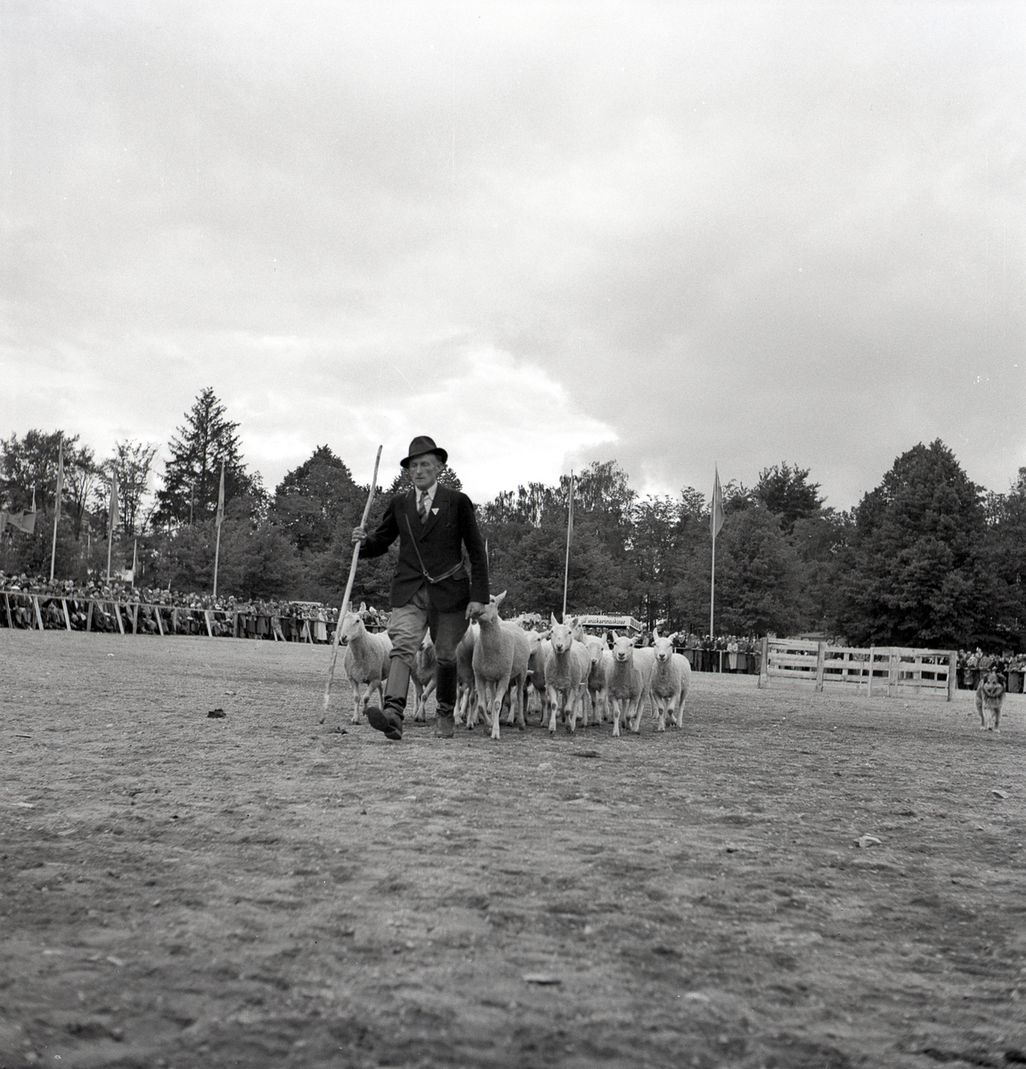 Uppvisning av vallhund på skolgården. En man leder iväg den hopsamlade