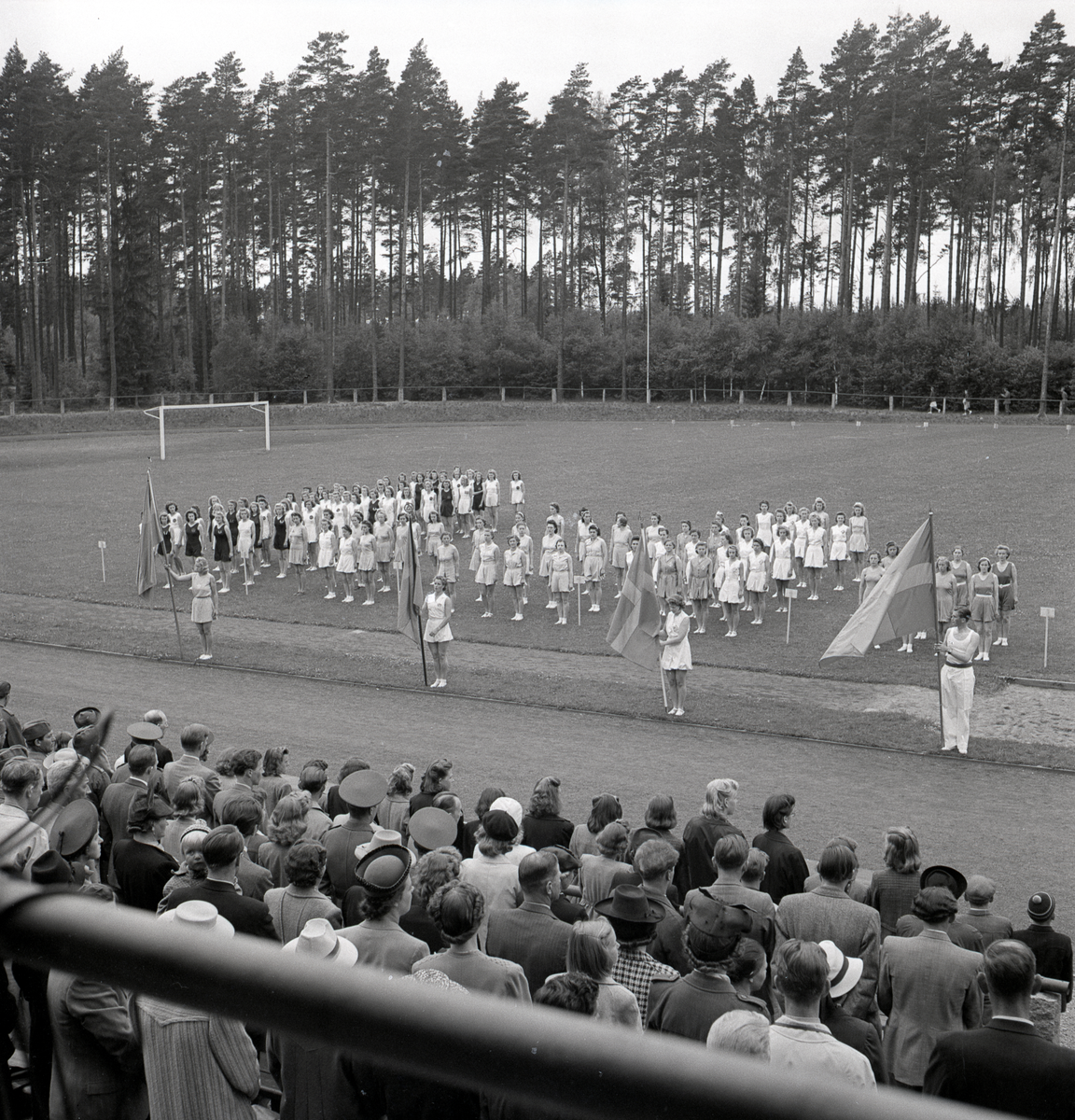 Uppställning av gymnaster på Värendsvallen under Gymnastikens dag.