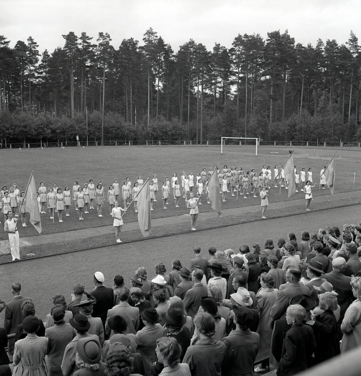 Uppställning av gymnaster på Värendsvallen under Gymnastikens dag.