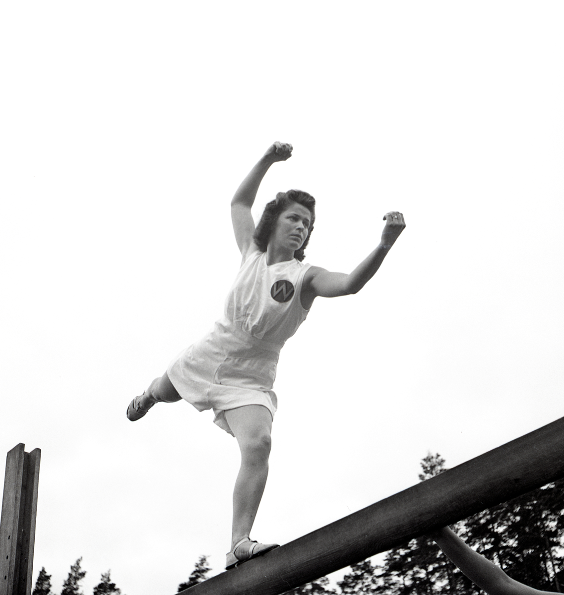 Uppvisning på bom av kvinnlig gymnast under Gymnastikens dag.