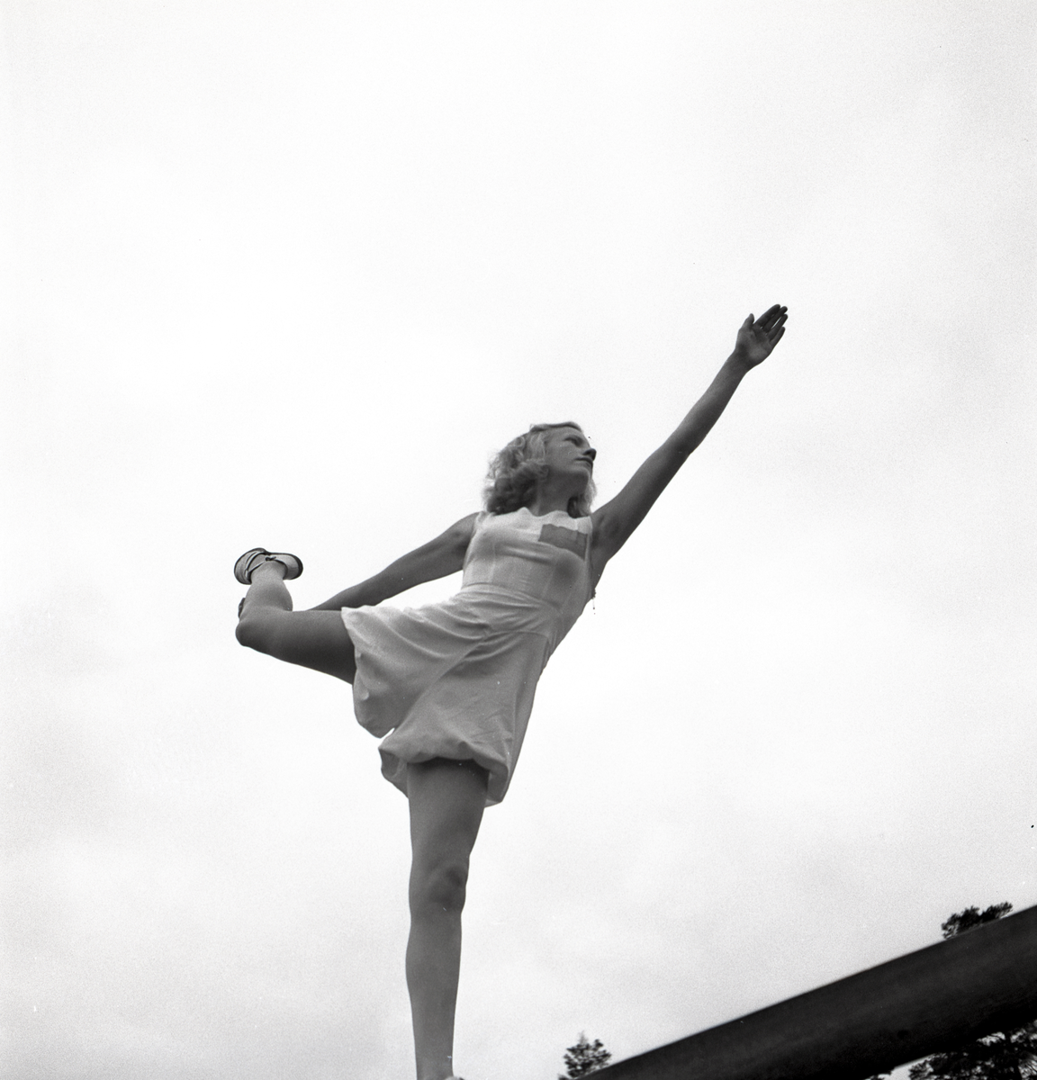 Uppvisning på bom av kvinnlig gymnast under Gymnastikens dag.