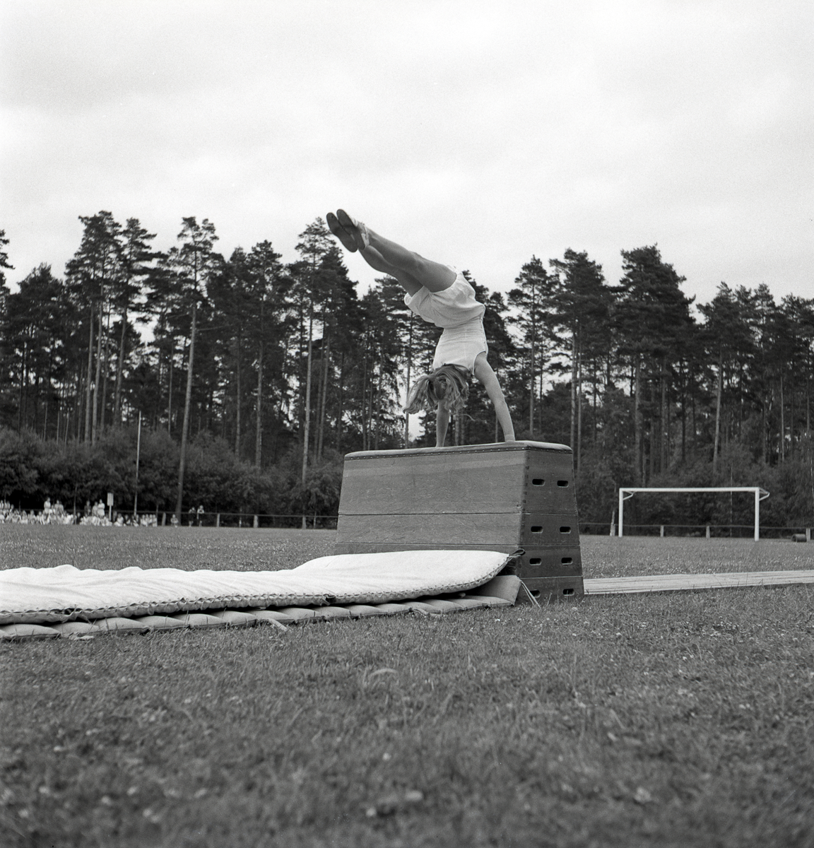 Titel: Uppvisning på plint av kvinnlig gymnast under Gymnastikens dag.