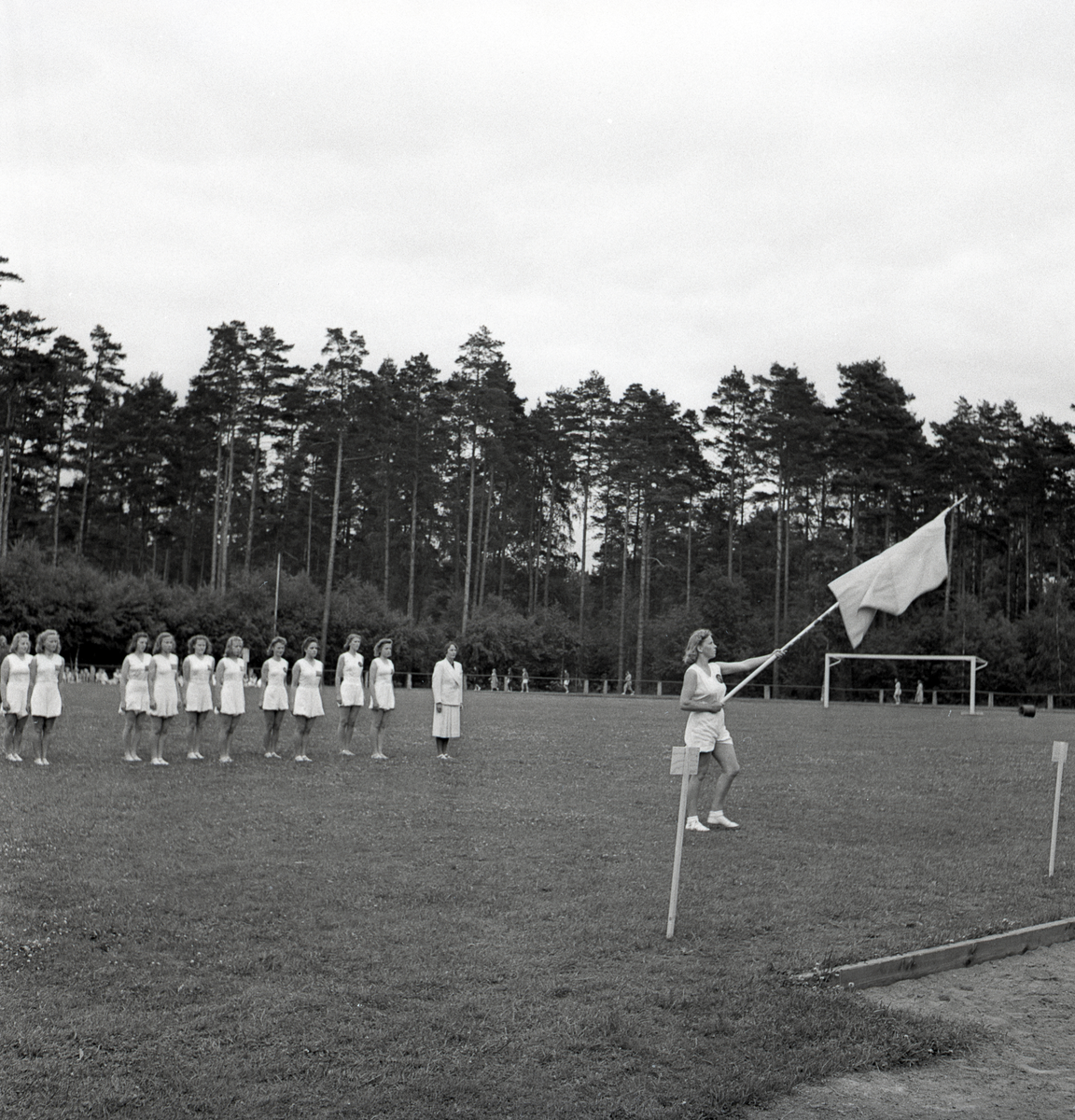 Parad med fana framför en kvinnlig gymnastiktrupp under Gymnastikens dag.