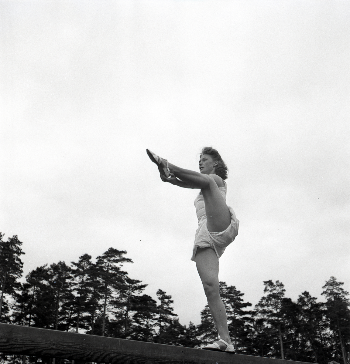 Uppvisning på bom av kvinnlig gymnast på Gymnastikens dag.