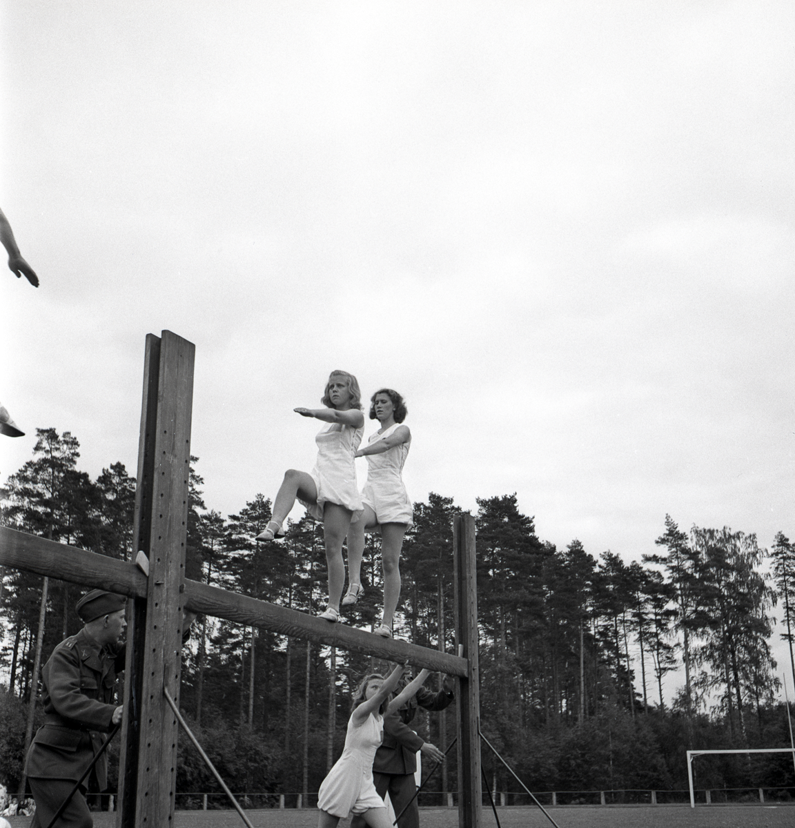 Uppvisning på bom av kvinnliga gymnaster på Gymnastikens dag.