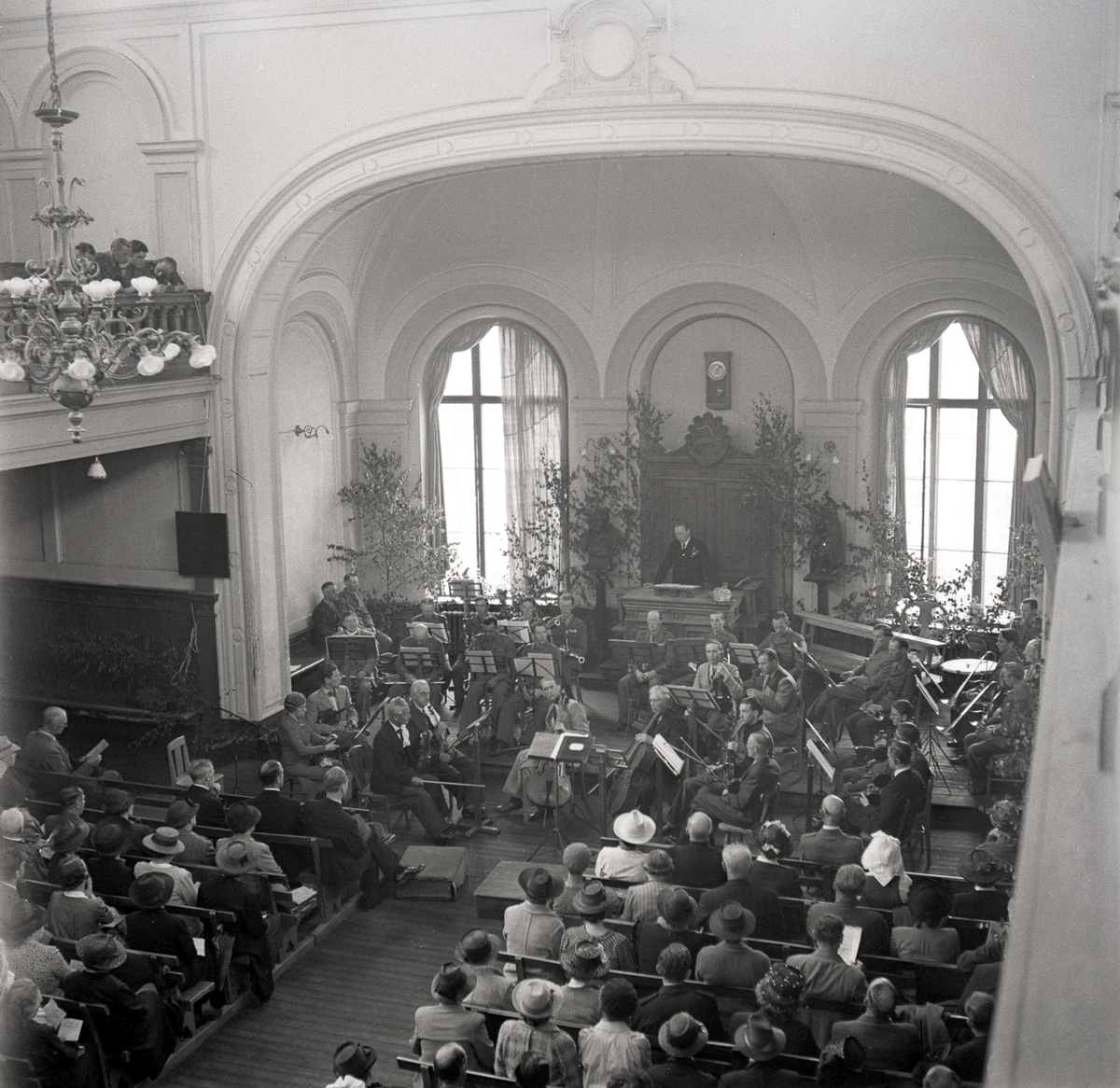 Aulan på Växjö Högre Allmänna Läroverk. Det pågår ett föredrag, trol. i samband med en konsert.