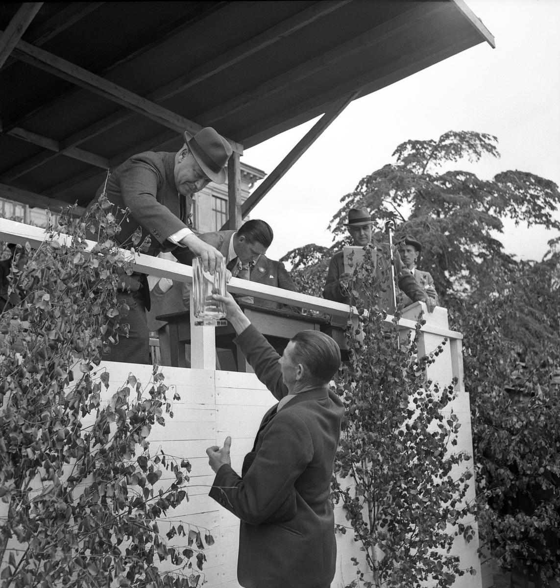 Prisutdelning från hedersläktaren. En man får en glasvas.
