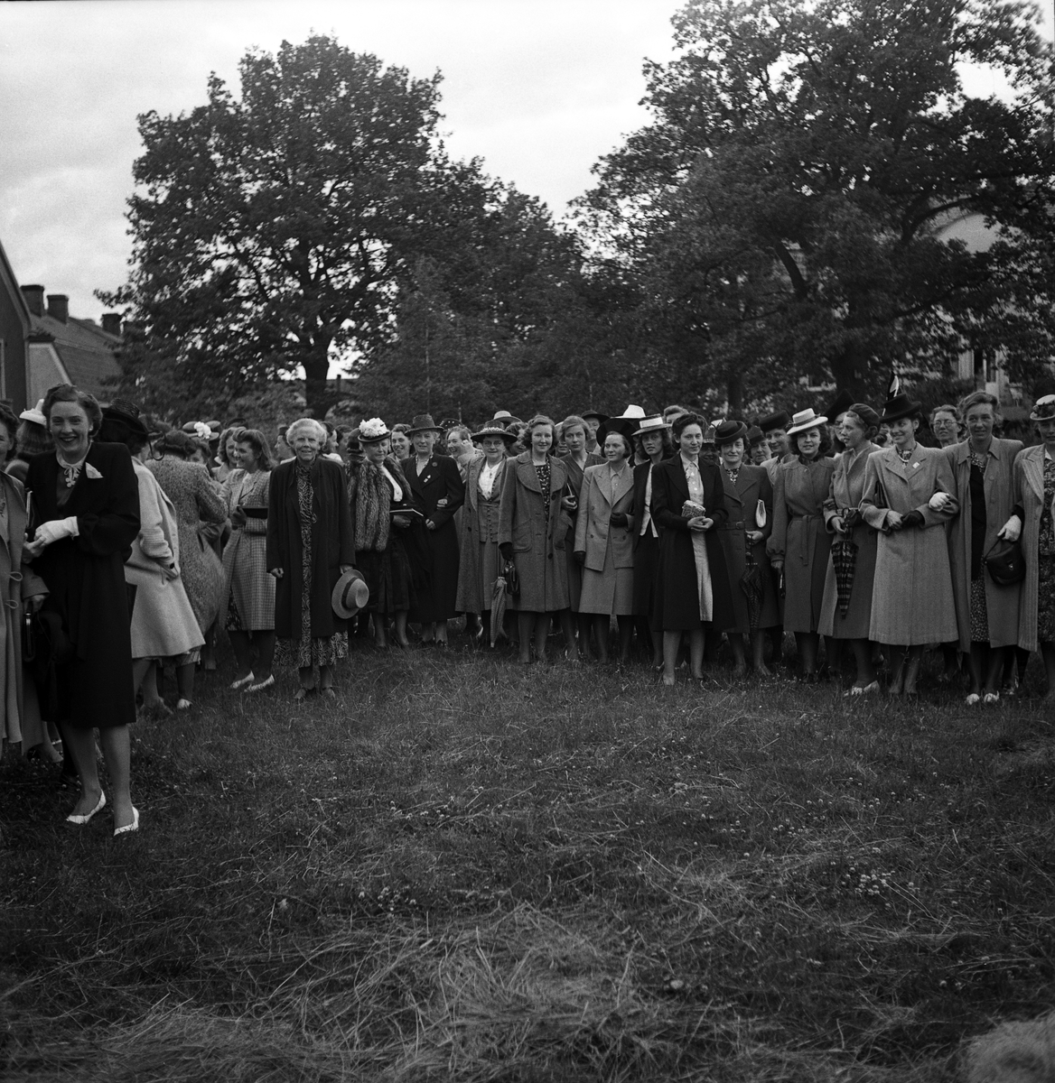 Ett antal uppklädda, glada damer har samlats för skolträff, utanför