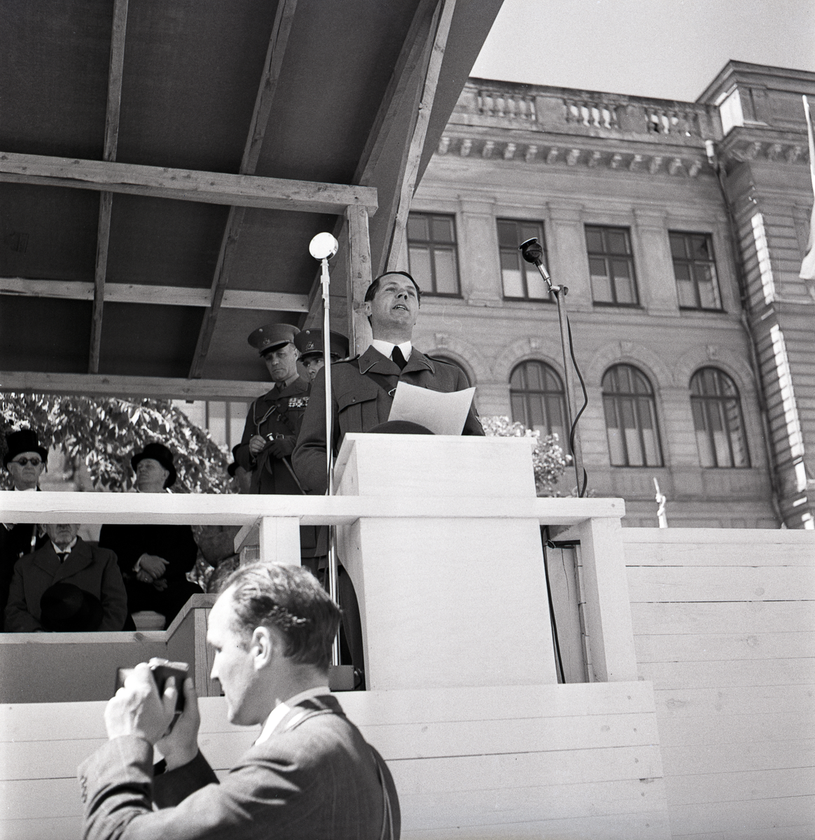Jubileumsutställningen. En av invigningstalarna. En fotograf har smugit sig in i förgrunden för att trol. ta kort på kronprinsen och kronprinsessan.