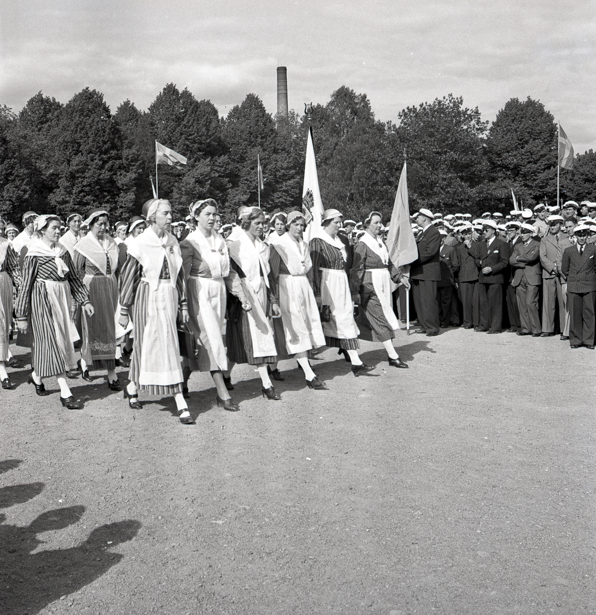 Ett antal kvinnor i s.k. husmorsdräkt (tillhörande Husmodersförbundet) tågar in på planen framför hedersläktaren.