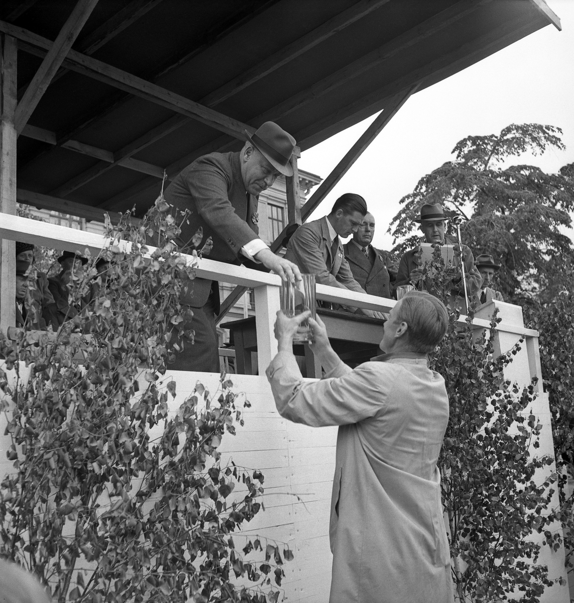 Prisutdelning från hedersläktaren. En man får en glasvas.