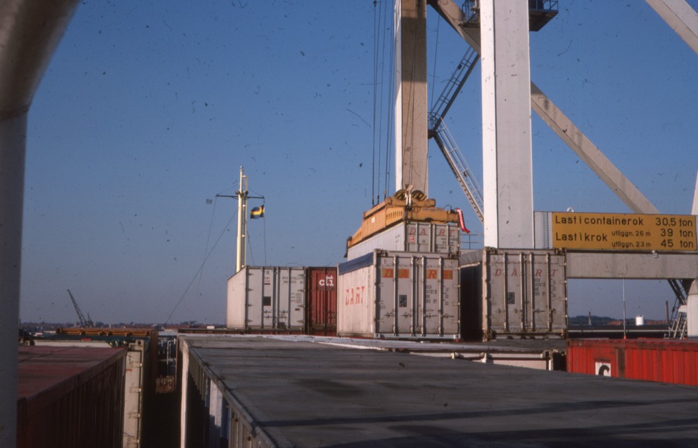 Bilden föreställer containrar staplade fotograferade i fågelperspektiv. Där bakom troligen del av lyftkran för containrar. Fyrkantig ställning med hissanordning. På en skylt står det "Last i containerok 305 ton, Last i krok, xxx 26 m 39 ton, xxx 23 m 45 ton"