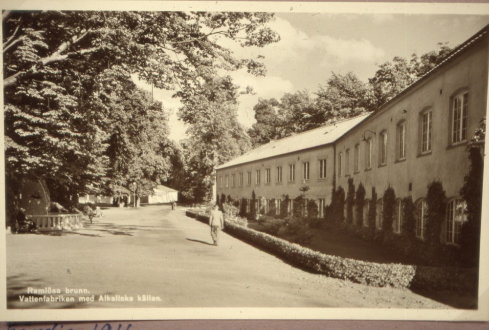 Bilden föreställer till höger en två våningsbyggnad med rabatt framför, med låg häck. Till vänster träd och bakom dem också byggnad. Mitt i bild gångbana med en person. Nederst i foto står det "Ramlösa brunn. Vattnefabriken med alkaliska källan".