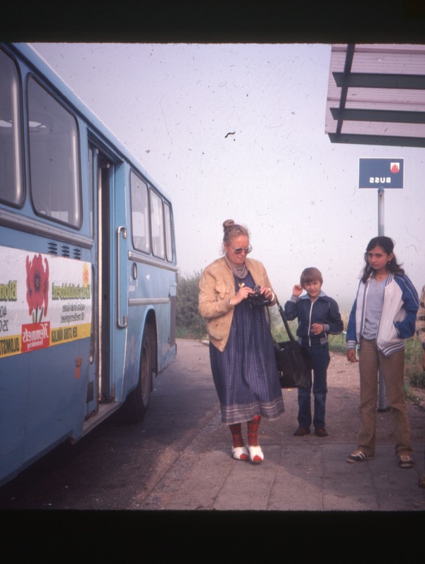 Bilden föreställer en buss på en busshållplats, med kommunloggan på skylten. Där står en kvinna och två barn. På en lapp i asken står det LB-färjan, Sinisia och Zavisa.