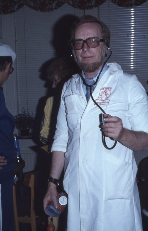 Bilden föreställer en man i vit rock i trekvartsformat med blodtrycksmätare och stetoskop. I förteckningen står det avskedskaffe, FEST.