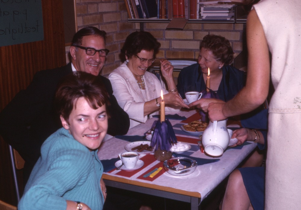 Bilden föreställer tre kvinnor och en man sitter vid ett bord med kaffekoppar, ljusstakar, bitsocker och kakfat. Ytterligare en kvinna serverar kaffe. I förteckningen står det Kollegiefest nov.