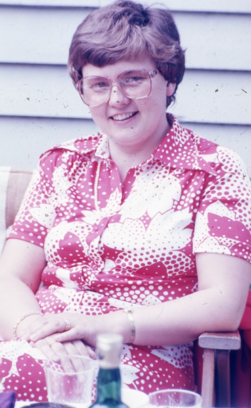 Bilden föreställer en kvinna i halvformat sittande framför husfasad. Bilden tillhör troligen Examenskaffe hos Brita Lundin 1979. På bilden står det Susanne Sundevall.