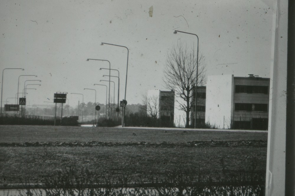 Bilden föreställer ett stort åkerområde, bevuxet med gräs. Bakom detta en väg med många lyktstolpar. Till höger tre flerbostadshus.