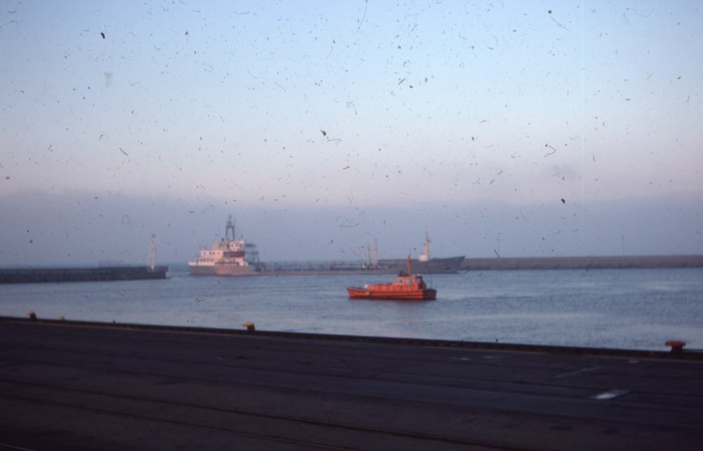 Bilden föreställer ett fartyg på väg mot hamn mellan pirer. I förgrunden mindre båt samt kaj.
