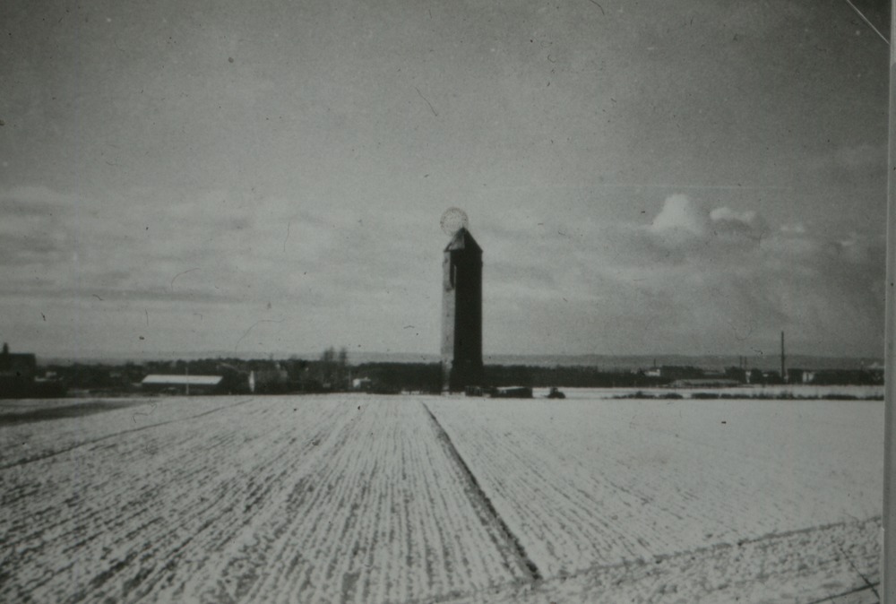 Bilden föreställer ett stort åkerområde, plöjt? I bakgrunden bebyggelse och ett vattentorn som sticker upp. Råå vattentorn.