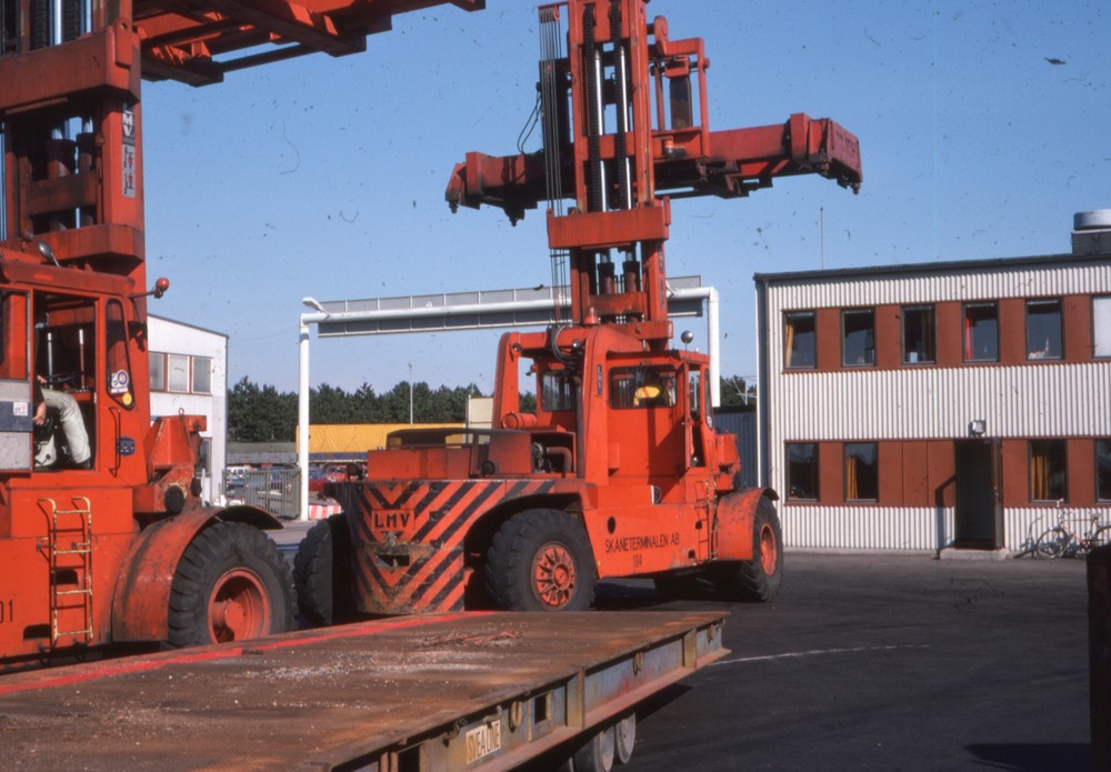 Bilden föreställer en öppen yta, bakom den kontorsbyggnad i två plan. Framför byggnaden står två truckar och ett släp. På trucken står det Skåneterminalen AB.