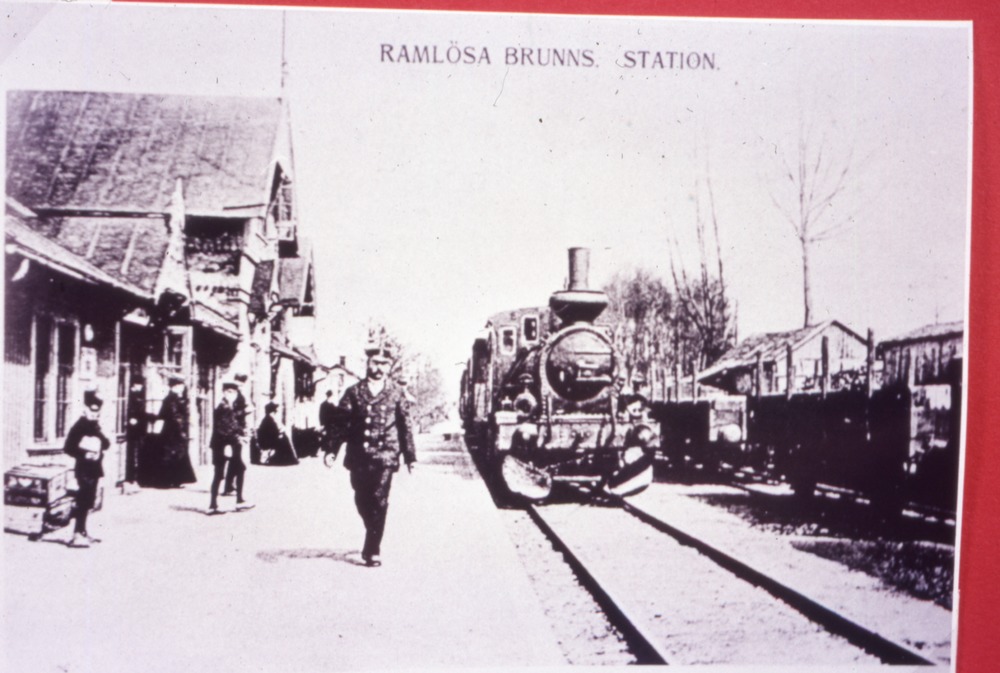 Bilden föreställer en järnvägsstation med stationshus, perrong, järnvägsspår med lok och godsvagnar. På perrongen går en stins och några andra männsikor. Överst i bilden står det "Ramlösa Brunns station".
