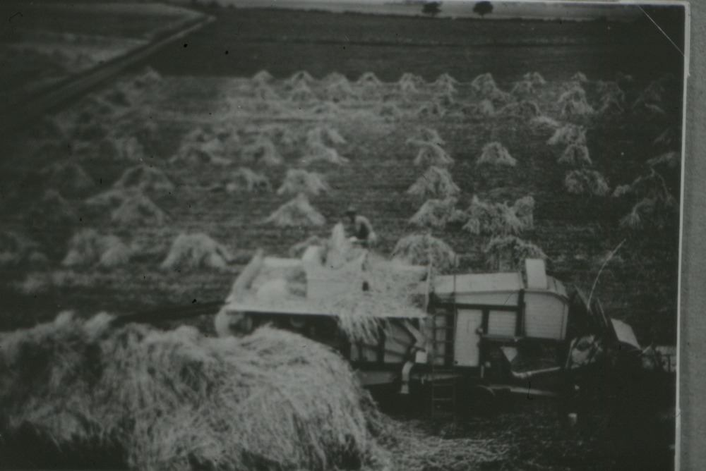 Bilden föreställer en landskapsvy. På en åker står hässjor med hö eller säd av något slag . I förgrunden troligen en skördetröska av något slag.